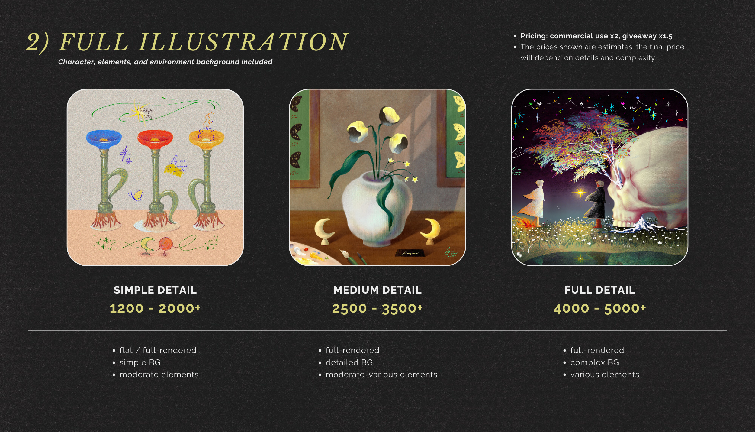 DURATION: ~ 5 - 20 วัน/ภาพ (ไม่รวมเวลารอคิว) ขึ้นอยู่กับรายละเอียดงาน อาจมีการเปลี่ยนแปลงตามช่วงเวลาต่าง ๆ โดยจะแจ้งให้ทราบล่วงหน้า หากมีเดดไลน์ในใจรบกวนสอบถามก่อนนะคะ *รับงานเร่งในบางกรณีเท่านั้น มีค่าบริการเพิ่มเติม 15-50% ของราคางาน